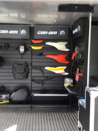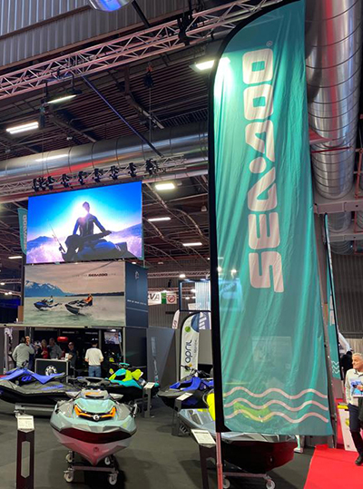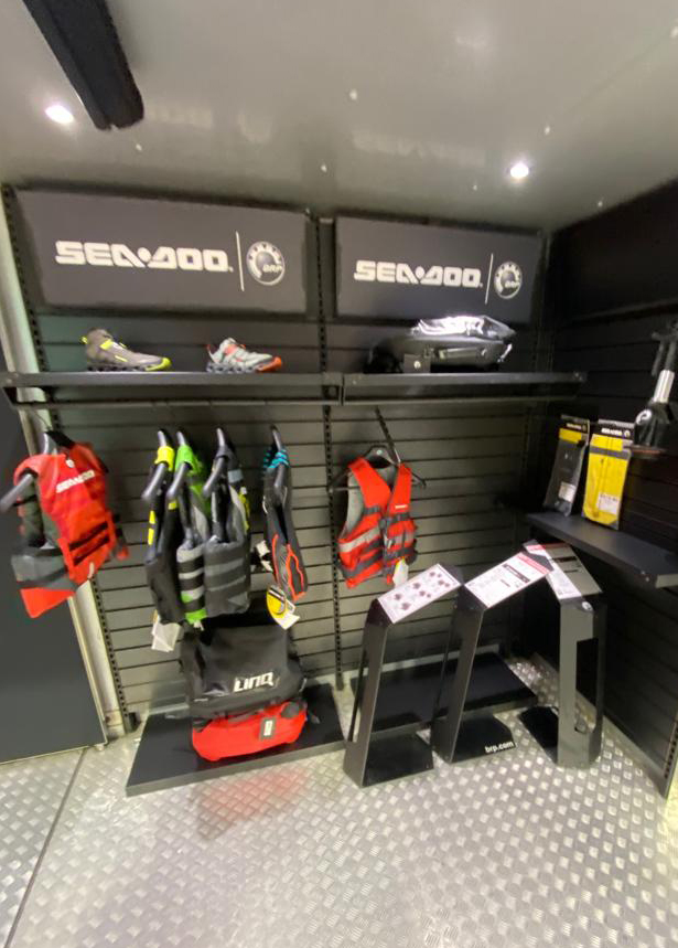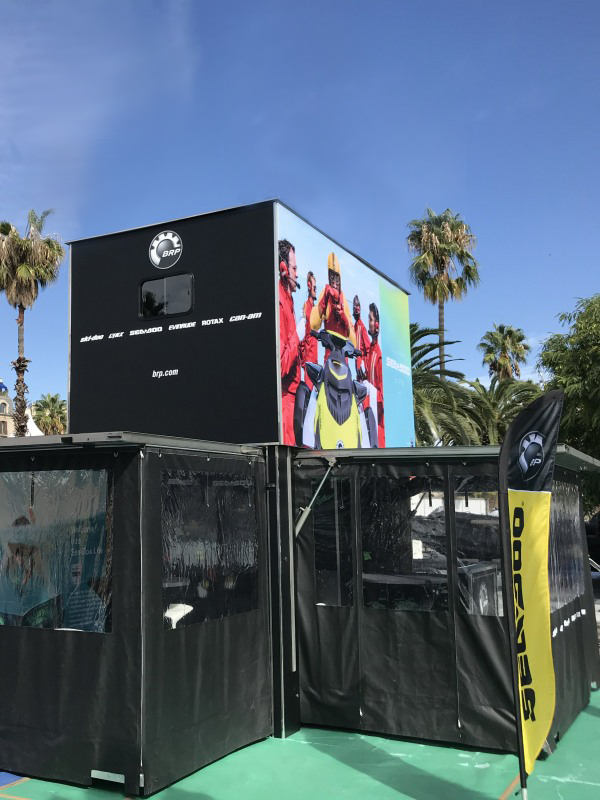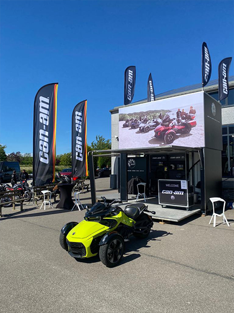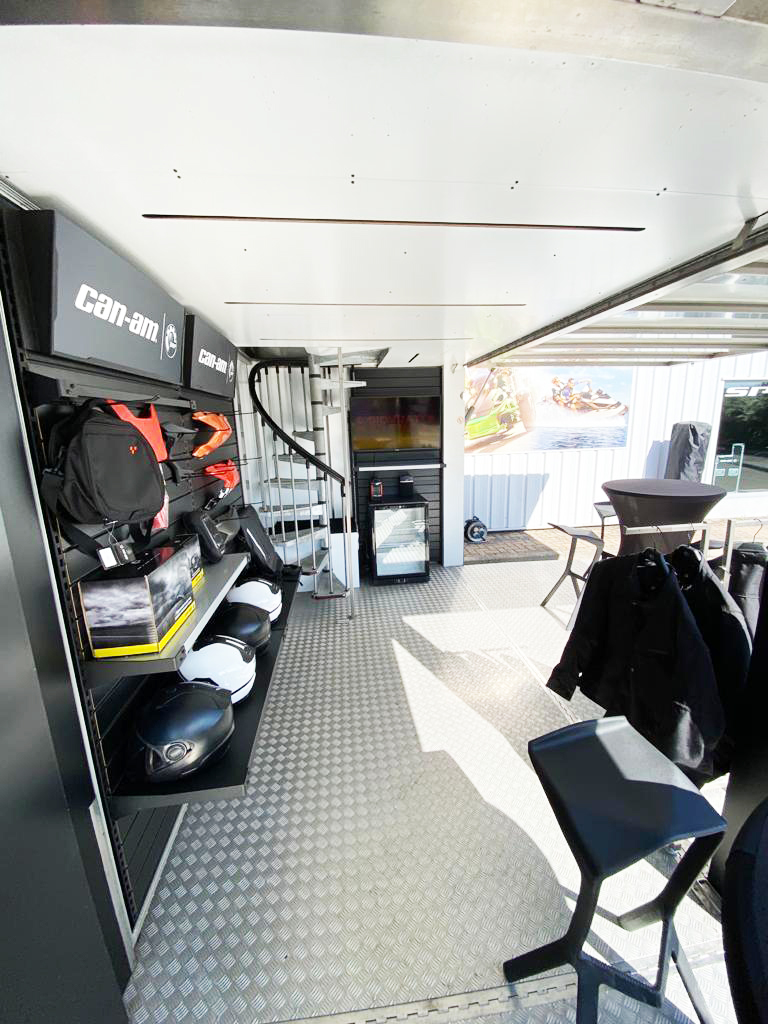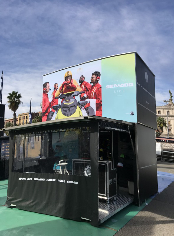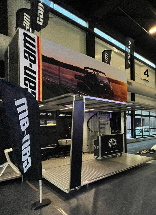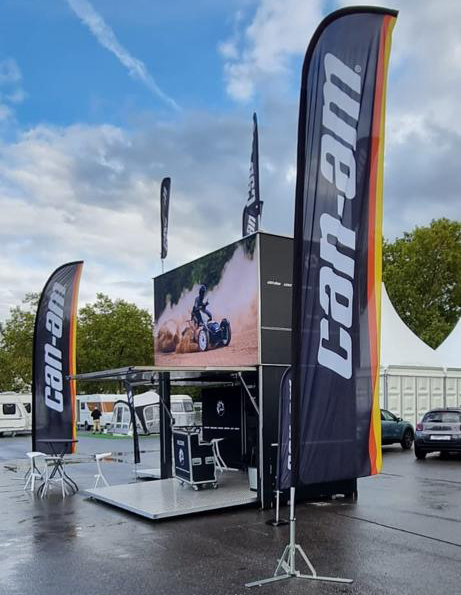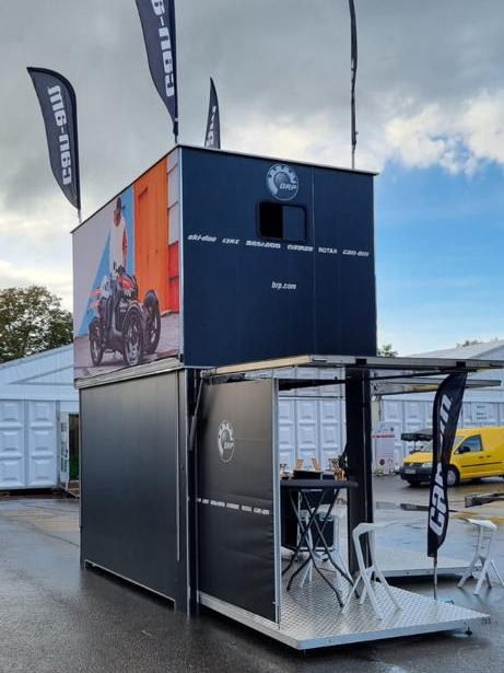 When the Show in a Box is placed, only the box remains which measures 4M10 X 2.3M. As soon as the box is ‘unfolded’ the deployed surface area is 6.4M X 4.6M (30sqm). The height of the structure is 4.8M (without the 4 proshop flags on the roof).